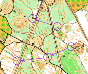 - Tramos cortos de orientación fina hacia controles en elementos claros y con líneas de parada (K10).