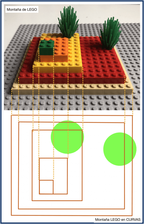 2. Desplazando al click arriba o abajo, repetiremos esta acción para representar nuevas curvas de nivel. Momento en el que introduciremos el concepto de equidistancia. Tomando como referencia el tamaño del muñeco, podemos calcular de forma estimada la diferencia entre líneas, e incluso la altura de la montaña.